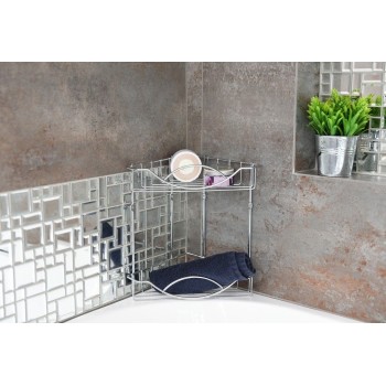 Rohová drôtená polička má priečne pruhy a ramená dlhé 8 cm. Drôtená polička s umiestnením do každého rohu kúpeľne alebo kuchyne.