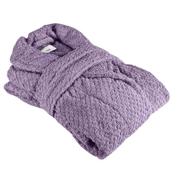 Nadčasový fialový unisex župan so šálovým golierom. Vyrobený z príjemného 100% bavlneného materiálu. Má praktické viazanie šnúrkou v páse.