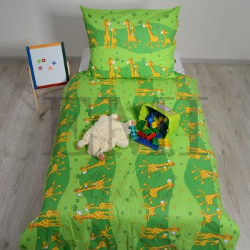 Obliečky detské žirafy sú posteľné obliečky zelenej farby, ktoré sú jemné na dotyk a krásne na pohľad. Zapínanie je vyriešené pomocou umelohmotných gombíkov. Sú vyrobené na Slovensku.