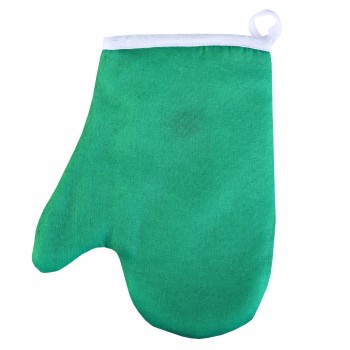 Zelená kuchynská rukavica štandardného tvaru s motívom džbánu. Povrch rukavice je 100% bavlna a výplň vatelín.
