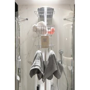 Chromovaná závesná polica do kúpeľne s dvomi poschodiami a možnosťu zavesenia uterákov. Praktický a štýlový pomocník v kúpeľni, ktorý poskytuje úložný priestor navyše. Vhodná aj do menších priestorov.