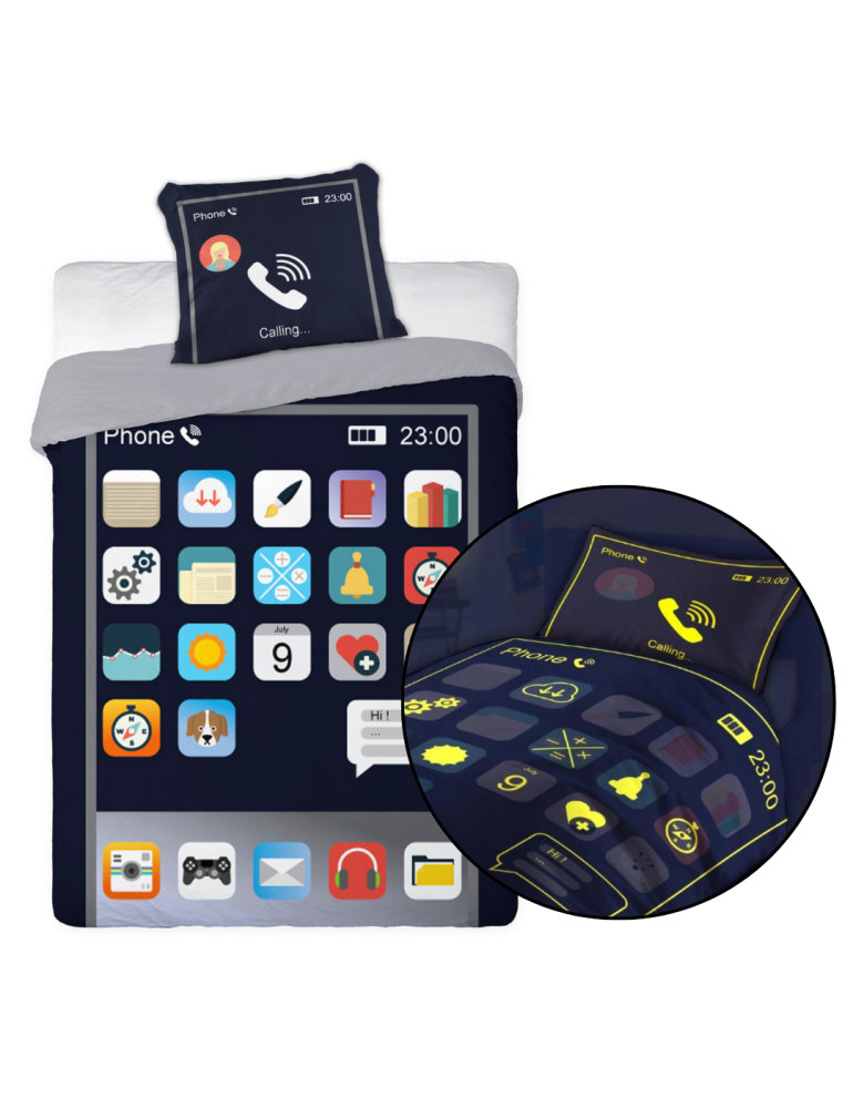 Detské obliečky Smartfon sú vyrobené zo 100% bavlny. Na dotyk sú jemné, pevné, trváce a moderný vzor, ktorý v noci svieti oživí každú detskú izbu. Zapínanie majú vyriešené pomocou zipsu.