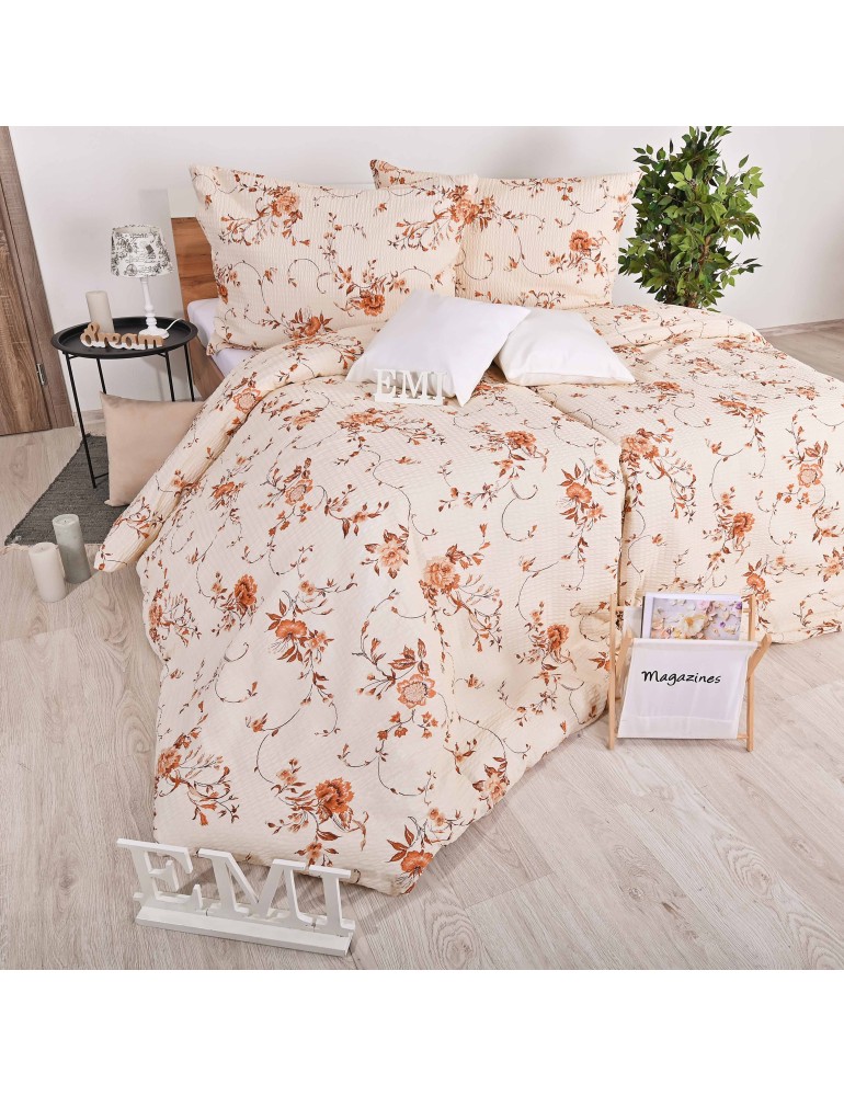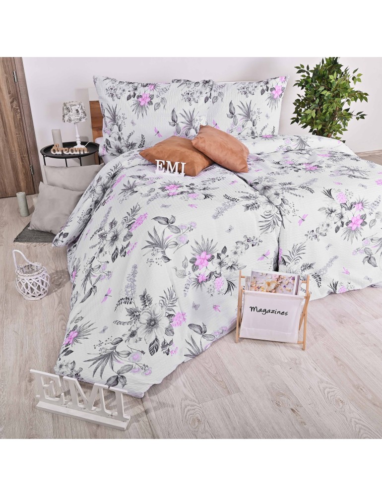 Krepové obliečky Anastasia sú vyrobené z nakrepovanej 100% bavlny delux. Krepové obliečky sú čoraz populárnejšie vďaka svojim špecifickým vlastnostiam a výhodám, ktoré ponúkajú. Ich výhodou je hlavne nežehlivý materiál s krepovým efektom, vďaka čomu sú obliečky ešte trvácnejšie. Sú vyrobené na Slovensku. Jednoduchý kvetinový vzor zaujme každého.