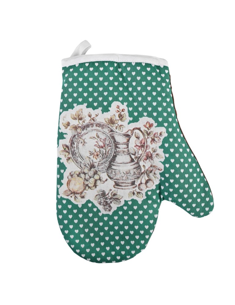 Kuchynská rukavica štandardného tvaru s motívom srdca dodá šmrnc každej kuchynke. Kuchynská chňapka chráni pred popálením rúk.