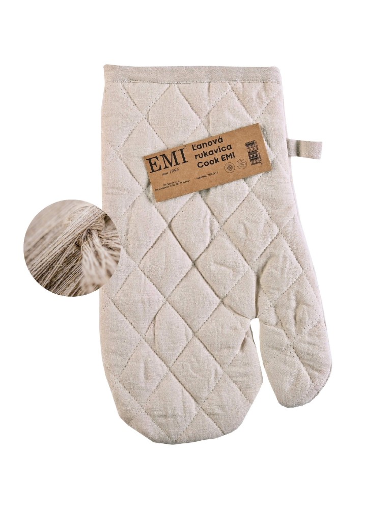 Kuchynská rukavica sa skladá z dvoch vrstiev. Vrchná vrstva kuchynskej rukavice je zhotovená z ľanovej látky. Ľan je najekologickejšia tkanina, ktorá je ideálna aj pre jemnú pokožku. Považuje sa za najsilnejšie a najpevnejšie prírodné vlákno. Nezachytáva na seba také množstvo prachových častíc a je ideálny aj pre alergikov. Ľan dobre absorbuje a odvádza vlhkosť i teplo. Vnútornú vrstvu tvorí takzvaný vatelín. Ten chráni pred preniknutím tepla cez rukavicu, a tak ochráni vaše ruky. Obidve strany rukavice sú prešité. Pre lepšie uskladnenie, prípadne dekoráciu je na chňapke umiestnené pútko. Kuchynskú rukavicu tak pohodlne umiestnite na vešiak.