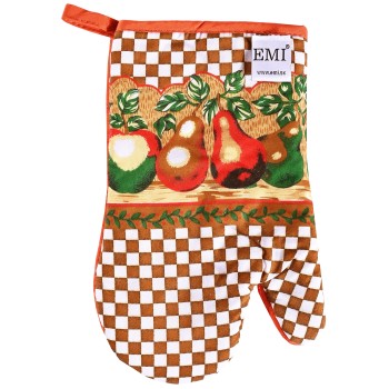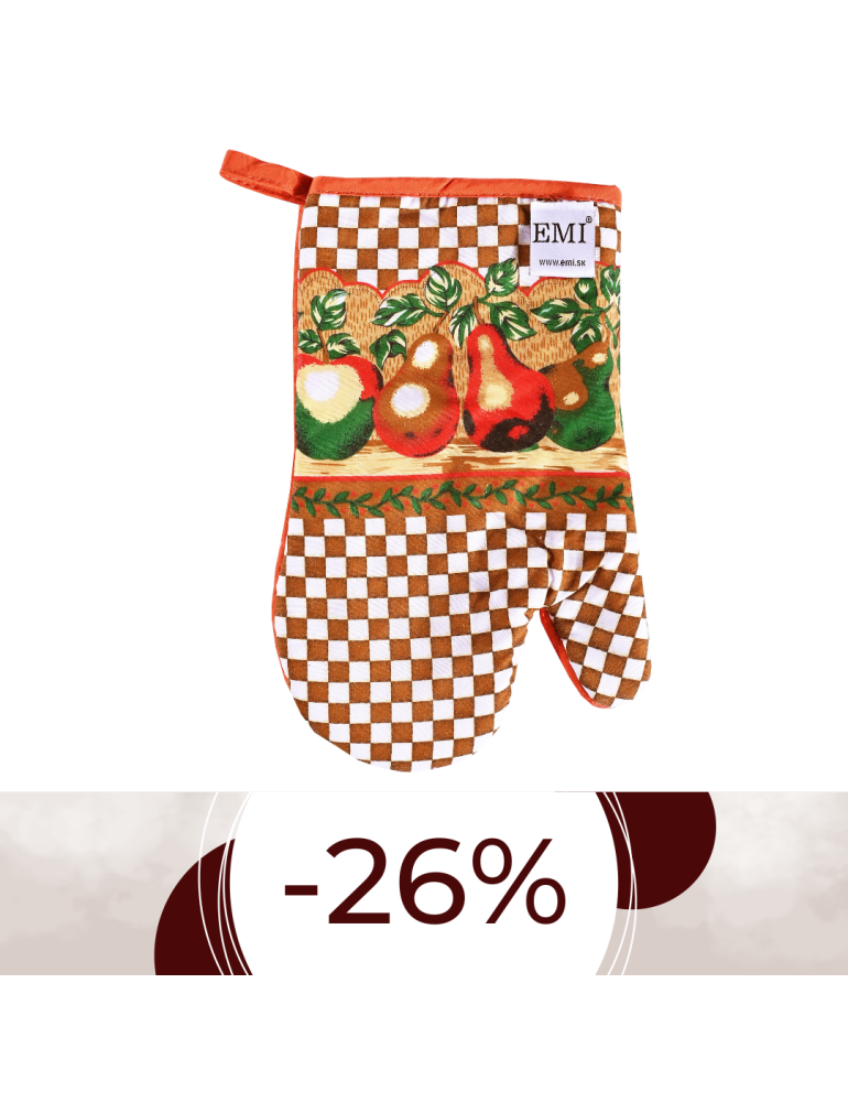 Hnedá kuchynská rukavica štandardného tvaru s motívom hrušky. Kuchynská rukavica je skvelým pomocníkom a nesmie chýbať v žiadnej domácnosti.