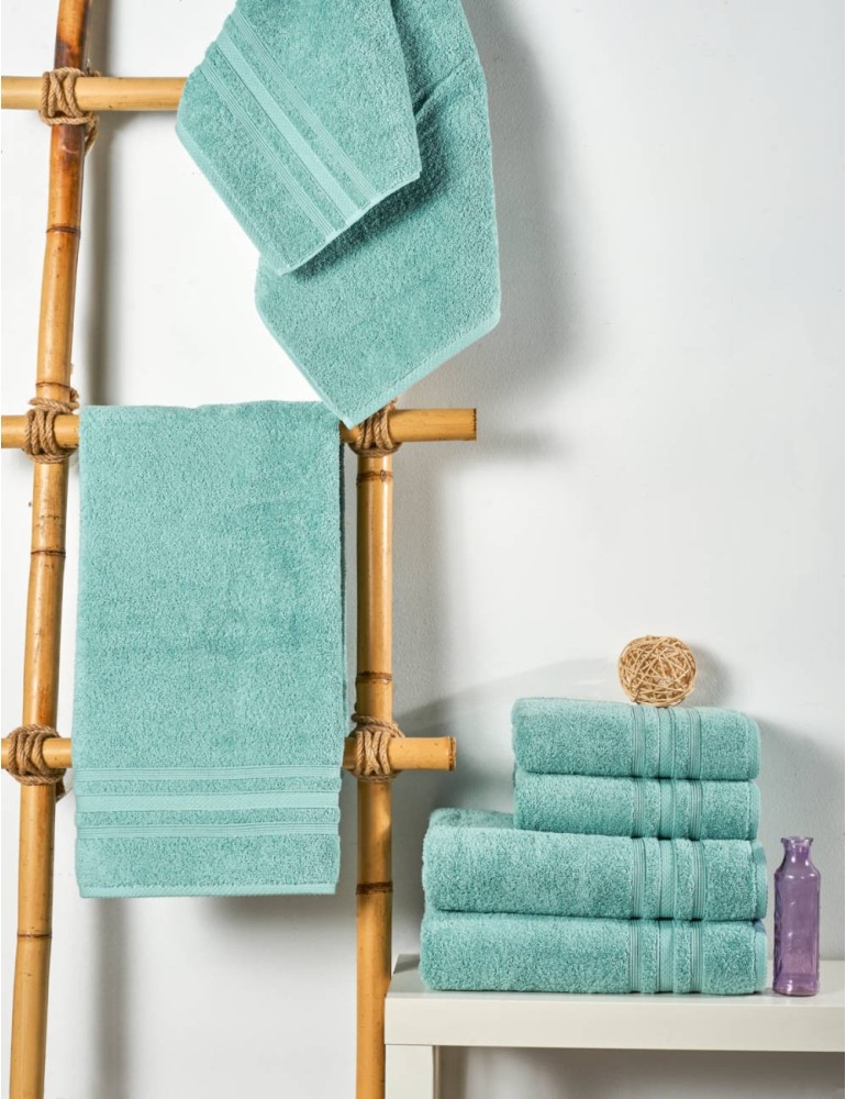 Praktická sada bavlnenej osušky a uterákov v mentolovej farbe s jednoduchým vzorom vnesie kúsok elegancie do každej kúpelne. Vyznačujú sa výbornou savosťou, rýchlym schnutím, farebnou stálosťou aj po viacnásobnom praní a jemnosťou. Balenie obsahuje 1x uterák 50x100 cm a 1x osušku 70x140 cm.