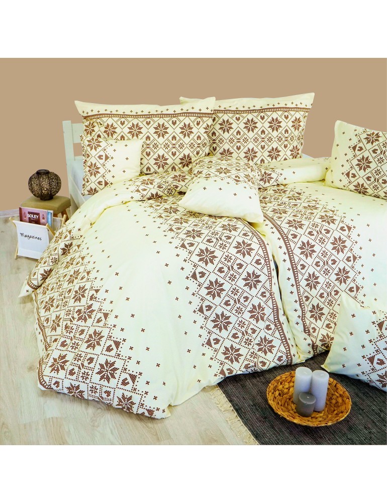 Posteľné obliečky bavlnené Etno EMI sú vyrobené z jemnej a vysokokvalitnej bavlny delux. Táto bavlna sa vyznačuje skvelými vlastnosťami ako jemnosť, trvácnosť, vysoká gramáž. Bavlna bola už v minulosti považovaná za jednu z najdôležitejších pestovaných rastlín, ktorá sa využívala hlavne na výrobu textílii. Už naši predkovia poznali bavlnu a na výrobu textílii sa používala už pred 12 000 rokmi. Jej vlákna sú získavané z kríka nazývaného bavlník. Do Európy zavítala už v deviatom storočí vďaka arabským kupcom. Krištof Kolumbus objavil bavlníkové plantáže už v 15. storočí a v 16. storočí sa bavlna rozšírila do celého sveta. Podiel pestovanej bavlny a jej produkcia v minulosti predstavovala až 80 %, v súčasnosti je to len 40 %.