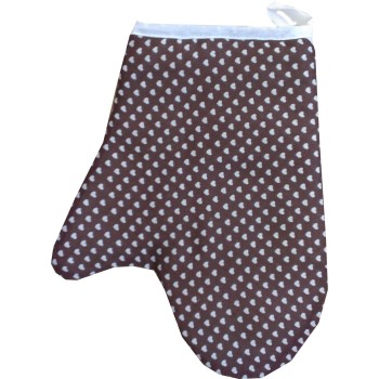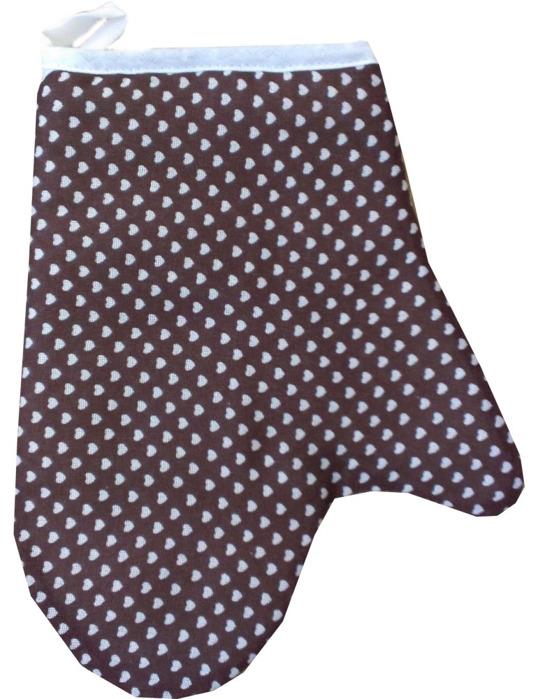 Hnedá kuchynská rukavica štandardného tvaru s jednoduchým motívom malých srdiečok po oboch stranách. Povrch rukavice je 100% bavlna a výplň vatelín.