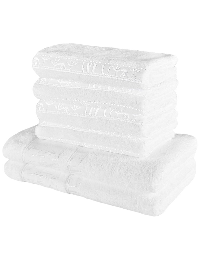 Biele bambusové osušky a uteráky si veľmi rýchlo obľúbite vďaka vlastnostiam, ktorými disponujú. Sú rýchloschnúce, príjemné na dotyk, antialergické a zabraňujú tvorbe baktérii a plesní. Set obsahuje 2 kusy bielych bambusových osušiek 70x140 cm a 4 kusy bielych bambusových uterákov 50x100 cm.