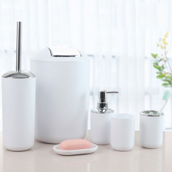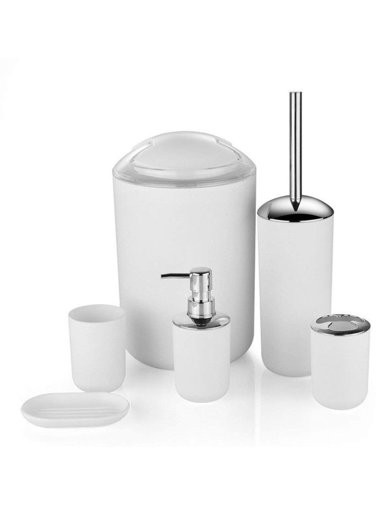 Biela 6-dielna kúpeľňová súprava je vyrobená z kvalitného materiálu. Obsahuje odpadkový kôš, pohár, stojan na zubné kefky, mydelničku, dávkovač tekutého mydla a WC kefu so stojanom.