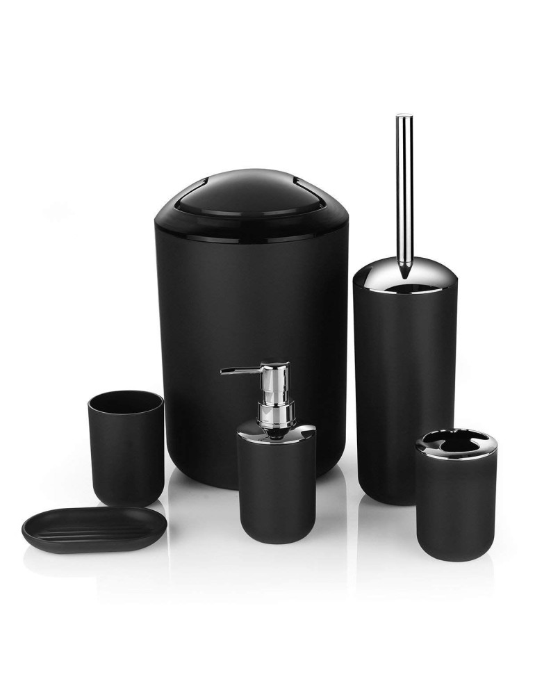 Kúpeľňové doplnky Levi sa vďaka čiernej farbe hodia do každej moderne zariadenej kúpeľne. Sada obsahuje odpadkový kôš, pohár, stojan na zubné kefky, mydelničku, dávkovač tekutého mydla a WC kefu so stojanom.